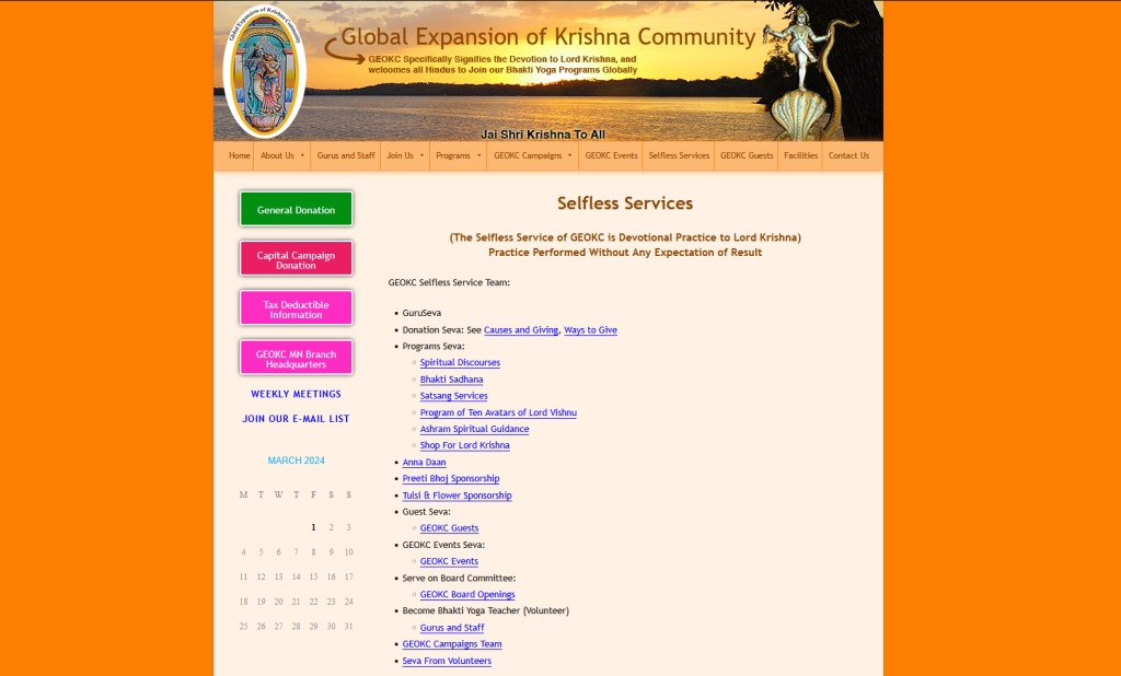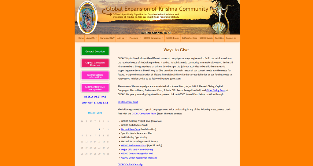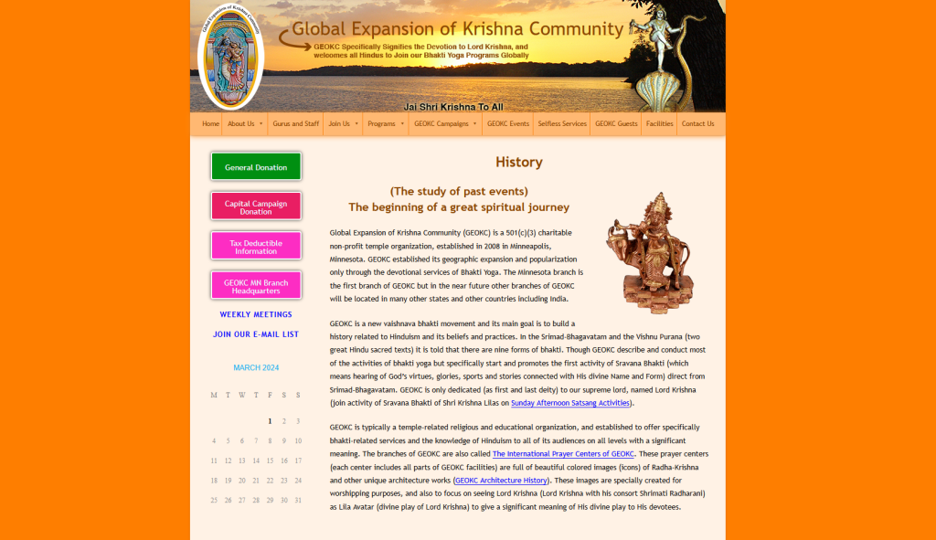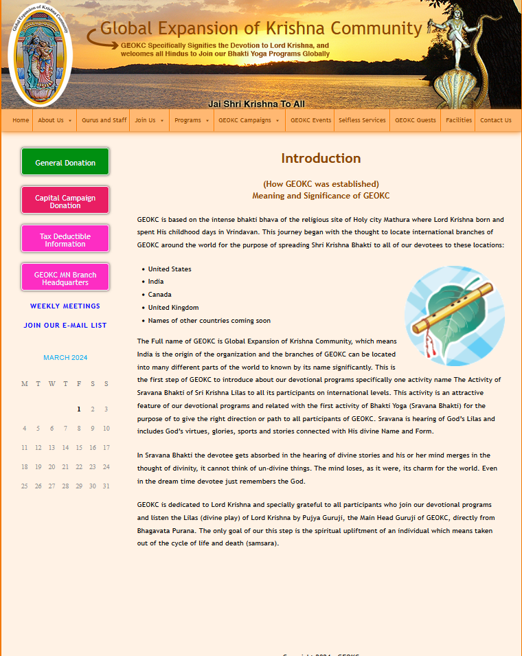 The Global Expansion of Krishna Community (GEOKC) functions as a religious non-profit temple organization dedicated to serving its community and spreading its message. Like many growing religious organizations, maintaining an accessible and informative online presence is crucial for connecting with members, sharing teachings, and facilitating support.