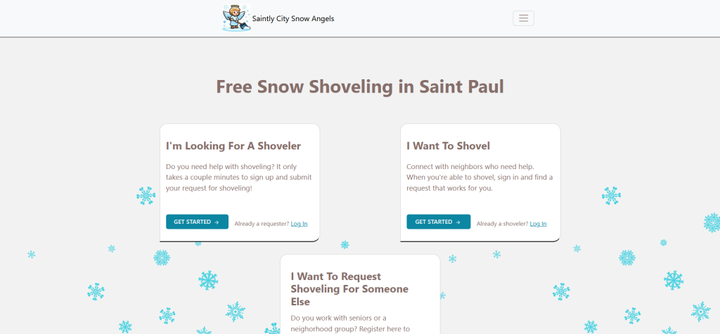 Saintly City Snow Angels is a St. Paul-funded snow shoveling service that provides free snow shoveling for those who request it.